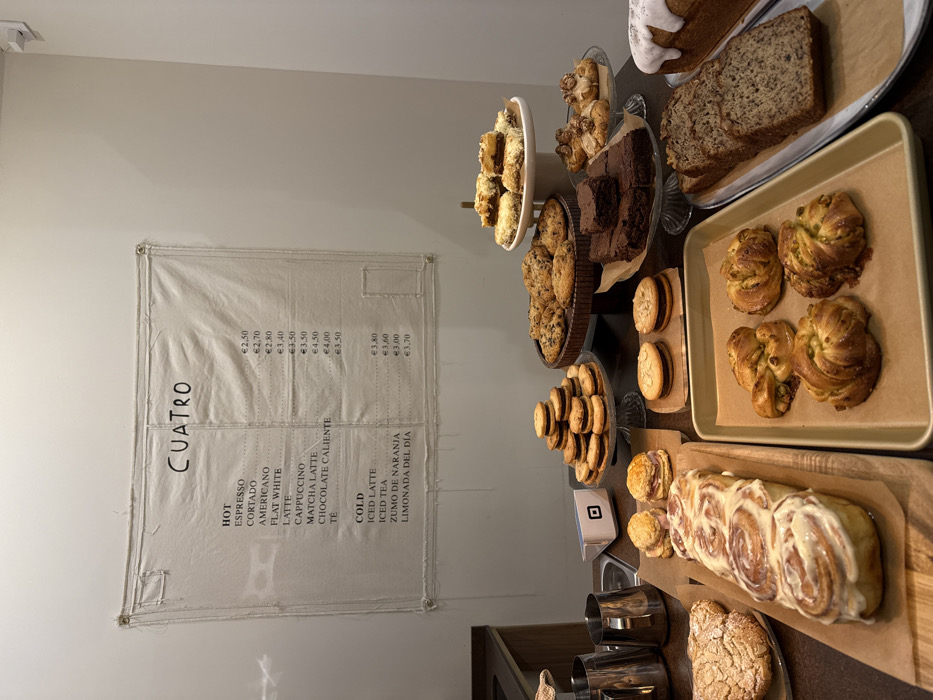 This image depicts the interior counter display of a cafe named "CUATRO" in Madrid, Spain