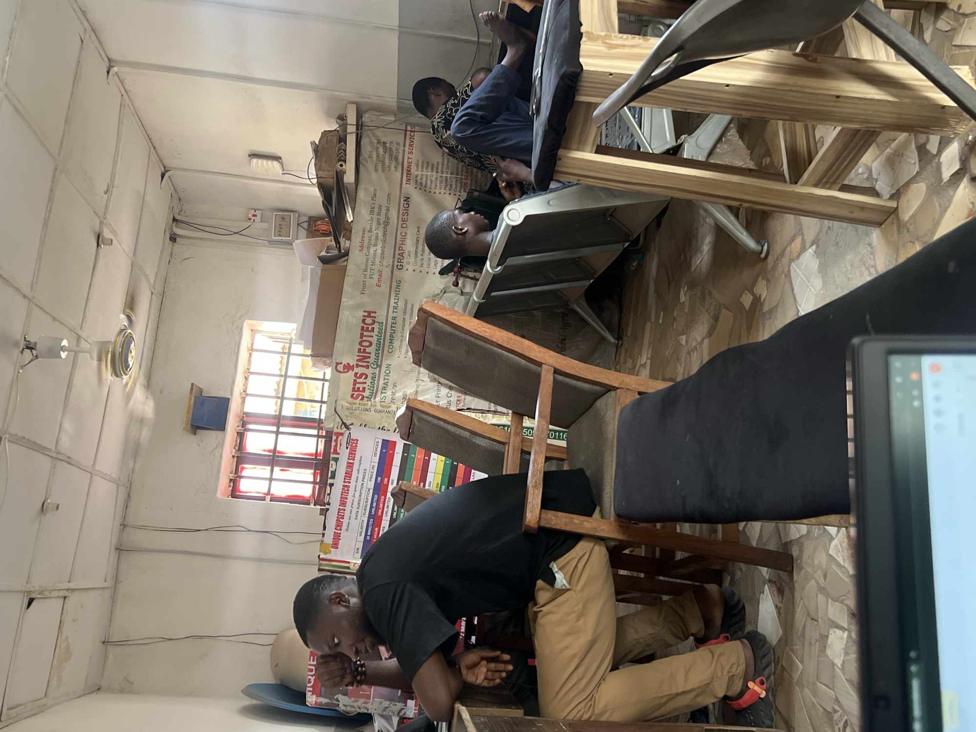 **Scene Description:** The image depicts a small, cluttered room in what appears to be a computer or internet cafe. The room has tiled floors and pale walls. A promotional poster advertising "UNIQUE CHIPSETS INFOTECH STARLINK SERVICES" and other computer-related services is prominently displayed. The poster lists data subscription prices, computer training, graphic design, and internet services. Several young men are present. One man is leaning on a table, seemingly asleep. Another two men are sitting in chairs, one with his feet up and seemingly looking at a device. Additional individuals are possibly seated. The location is possibly in Barako, Nigeria. The poster mentions "FUT Minna, Bosso Niger State," which suggests a connection to the Federal University of Technology, Minna, located in Bosso, Niger State, Nigeria. Bosso is near Barako. The poster also has contact information and a list of services that are provided. The chairs are a mix of wooden and metal-framed. A computer screen is partially visible in the foreground.