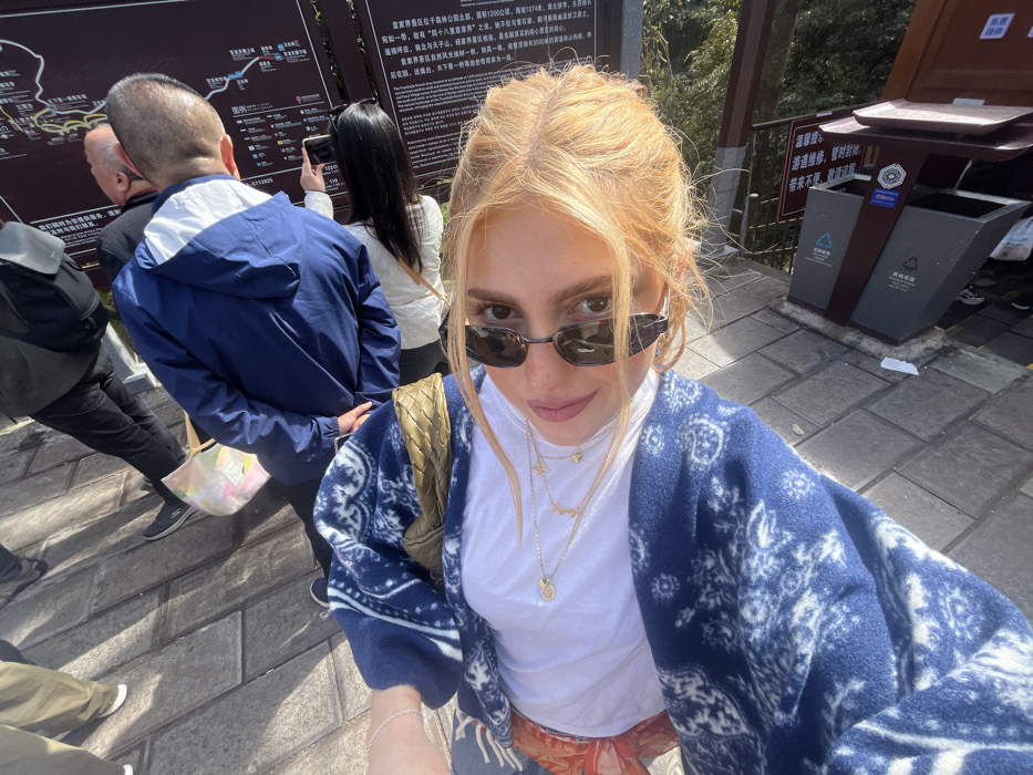 A woman with blonde hair and sunglasses takes a selfie in front of a group of people reading a large sign. The sign contains text in Chinese and appears to be a map or guide to the Yuanjiajie Scenic Area within the Zhangjiajie National Forest Park. A trash receptacle is visible to the right of the woman. She is wearing a white t-shirt, a blue and white shawl, and several gold necklaces.