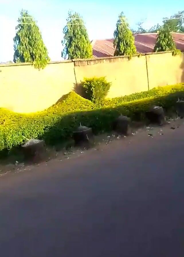 street with a high wall on one side, decorated with green shrubs and trees. At the start, the road is clear, but soon a silver car passes by. A woman walks in the opposite direction. Shortly after, a young girl wearing a school uniform walks along the road carrying a blue plastic container on her head.