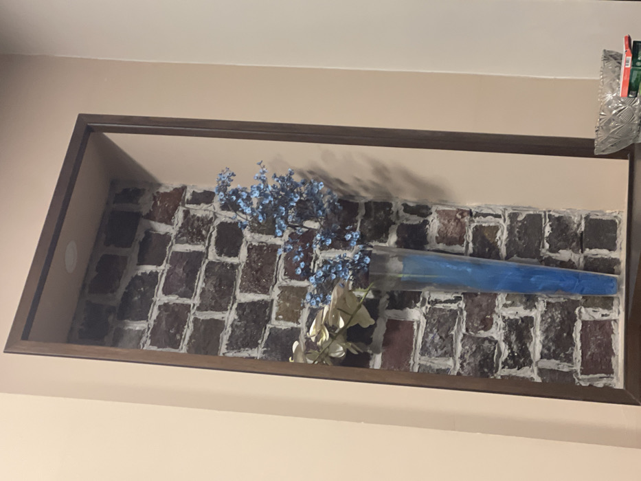 A brown-framed recessed shelf is visible against a beige wall. Inside, a brick pattern provides a backdrop for floral arrangements. A bouquet featuring small blue flowers and white orchids is displayed alongside a cone-shaped object wrapped in blue material. A glass container with items is partially visible in the upper right corner, positioned above the shelf.