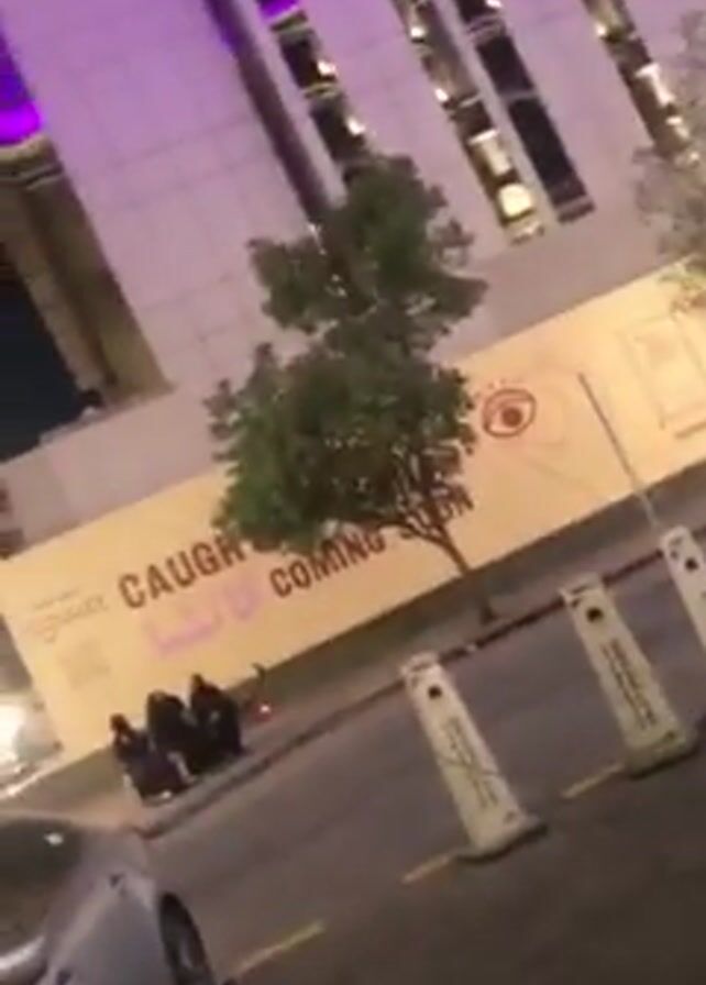 nighttime street scene. A light silver-colored car is parked on a brick-paved area, with its left side facing the camera. In the background, a group of people in dark clothing, possibly abayas, stand near a temporary wall with the words "CAUGHT KAITA COMING SOON" written on it. The wall is in front of a tall building that has purple lighting accents. There is a small tree between the wall and the building. A street lamp is visible on the left side of the frame. A yellow painted line is visible next to the parked car.