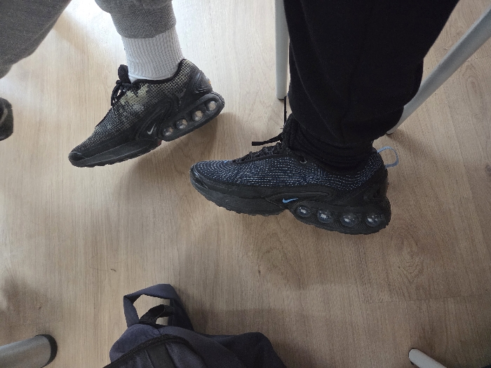 The scene is an indoor environment in Panagyurishte, Bulgaria, featuring a light-colored wooden floor. The primary subjects are the lower legs and feet of two individuals. In the lower-left quadrant, a person's left foot wears a black athletic shoe with a textured blue and black knit upper, a blue Nike swoosh, and five visible air-cushioning units on the lateral side of the sole. This individual wears black trousers. A white or light-grey metal chair leg is partially visible to the lower-left of this foot. In the upper-right quadrant, another person's right foot wears a black and olive-green patterned athletic shoe, also featuring visible air-cushioning units in the sole, paired with light grey sweatpants and white socks. A dark blue fabric backpack with visible straps rests on the floor in the lower-left quadrant. The individuals appear to be seated, with their feet positioned on the floor.