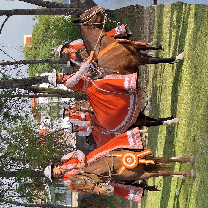 A line of women on horseback parade across a green lawn. The women wear matching orange dresses with white lace detailing and wide-brimmed white hats. Their horses are brown and chestnut, some adorned with orange ribbons and rosettes. Trees line the left side of the frame, and a building is visible in the background, adding depth to the scene. The overall composition suggests a cultural event or equestrian performance.