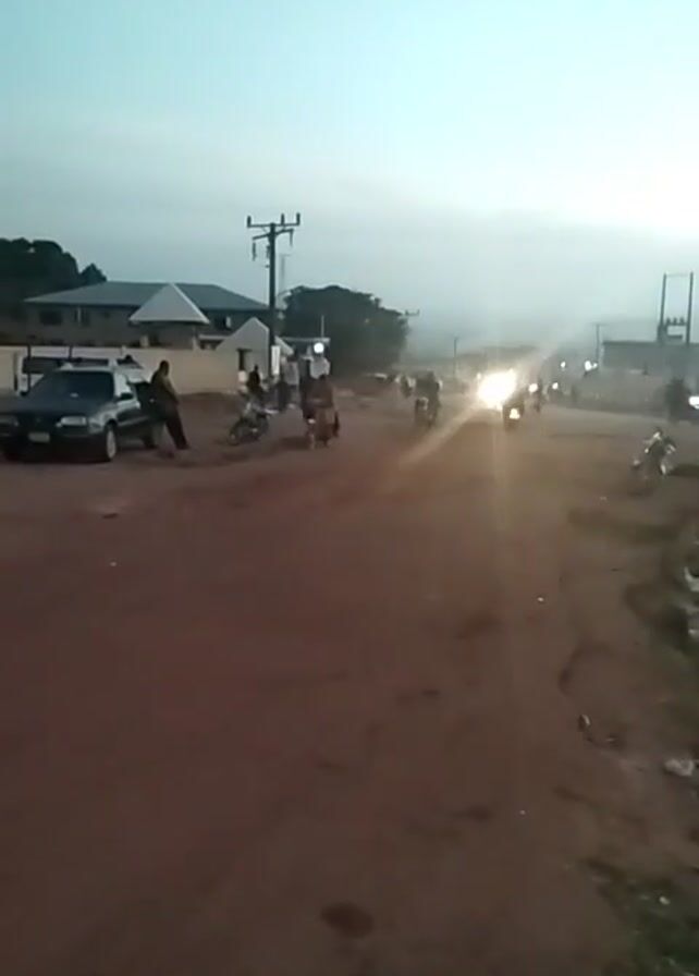 The video depicts a street scene in a residential area at dusk. The road is dirt-covered and appears to be unpaved. There are several motorcycles and a single dark-colored car visible. One person is standing near the car, while several others are riding motorcycles along the road. There are buildings and utility poles in the background. The sky is overcast.