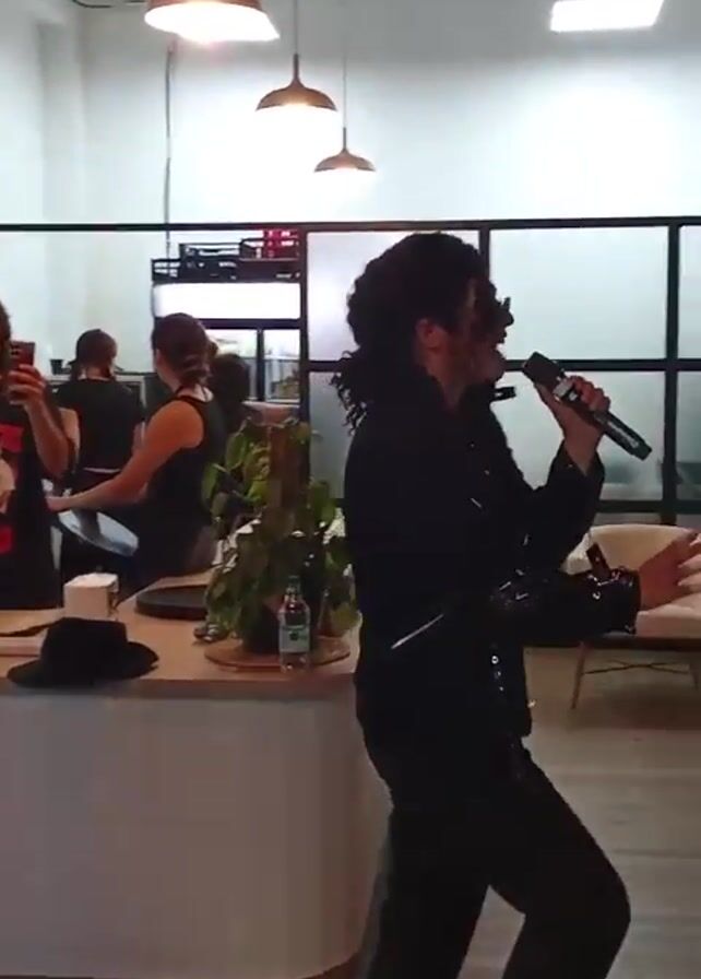person dressed as Michael Jackson singing in a restaurant. He's wearing a black jacket, white t-shirt, black pants, and sunglasses. He has dark curly hair, and he's holding a microphone and gesturing with his hands as he sings. There are several people in the background, some watching him and some working behind a counter. There's a woman in a t-shirt taking a video. Other people are sitting at tables and eating. The restaurant has a modern, clean design with wooden floors, white walls, and pendant lights. There are framed photos of Michael Jackson on the wall. A black hat sits on the counter.