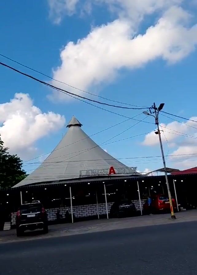 exterior of a building with a large, conical roof. The building is labeled "LANGSA CITY". A black SUV is parked in front. A motorcycle drives past the building on the street. The sky is blue with scattered clouds. The camera pans slightly to the left to show a tree. Power lines are visible overhead.