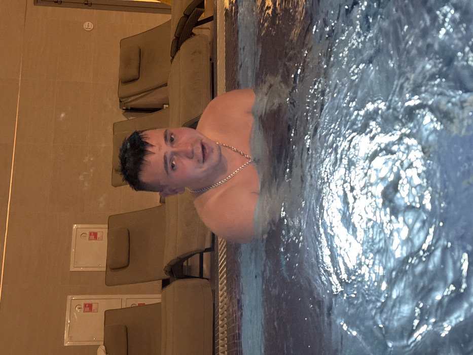 A man with short, dark hair and a silver chain stands in a pool, looking at the camera with an open mouth. The water around him is churning. Behind him, there are lounge chairs lined up against a wall, and fire safety boxes are visible on the wall. The image is rotated counter-clockwise by 90 degrees.