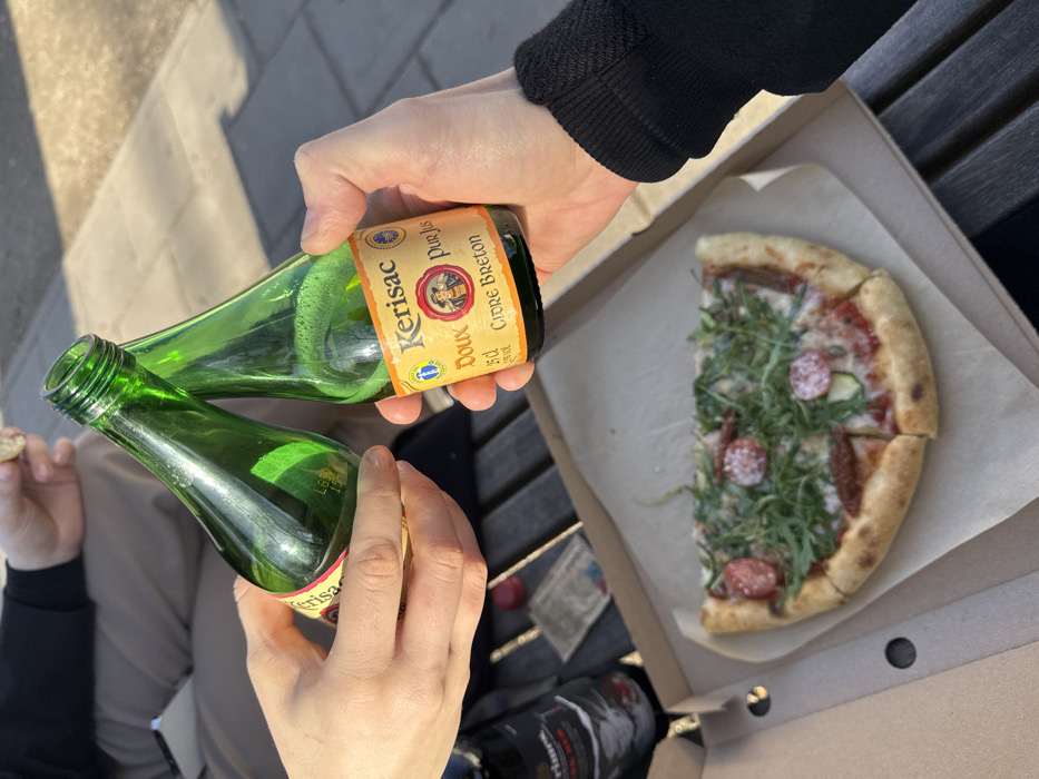 Two individuals engage in a toast outdoors, clinking two green glass bottles of "Kerisac Doux Pur Jus Cidre Breton." The person on the left holds a partially empty bottle, while the person on the right holds a bottle displaying foam, indicating it is fuller. Below their hands, a cardboard pizza box contains half of a pizza, topped with arugula, sliced salami, and possibly sun-dried tomatoes, resting on a brown paper liner. To the left of the pizza box, a dark bottle, partially labeled "Rammstein," and a red bottle cap are visible on a dark, slatted wooden surface, likely a bench or table. The scene is brightly lit by sunlight, suggesting an outdoor setting during the day. The specific location within Vilnius, Lithuania, cannot be determined from the visual evidence provided.