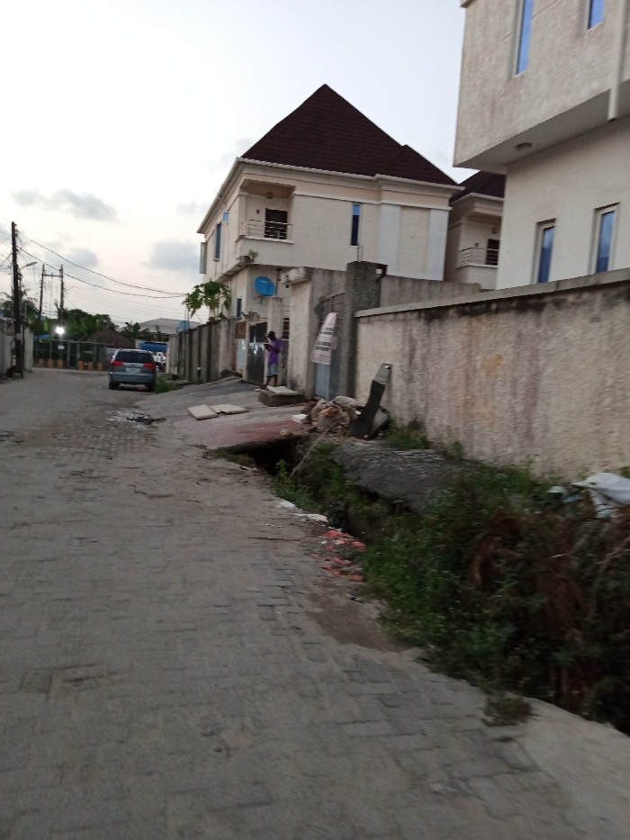 A neighborhood street view showcases buildings with light-colored facades and dark roofs. A weathered wall runs along the right side of the street, bordering overgrown vegetation and visible trash. The street itself is paved with interlocking bricks, showing signs of wear and tear. A damaged drainage area is visible near the wall. In the distance, a silver car drives down the road, past power lines. A person in purple clothes is visible standing near one of the buildings.