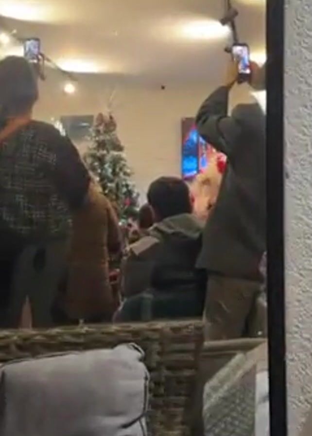 Christmas-themed indoor scene, likely a cafe or restaurant. There's a Christmas tree decorated with lights and ornaments in the background. Santa Claus is standing in front of a group of seated children. Several adults are standing around them, holding up their phones to record the scene. The video is shot through a window, with a wicker chair and a cushioned bench in the foreground. The lighting is warm and inviting. Overall, the scene captures a typical Christmas event, likely a meet-and-greet with Santa.