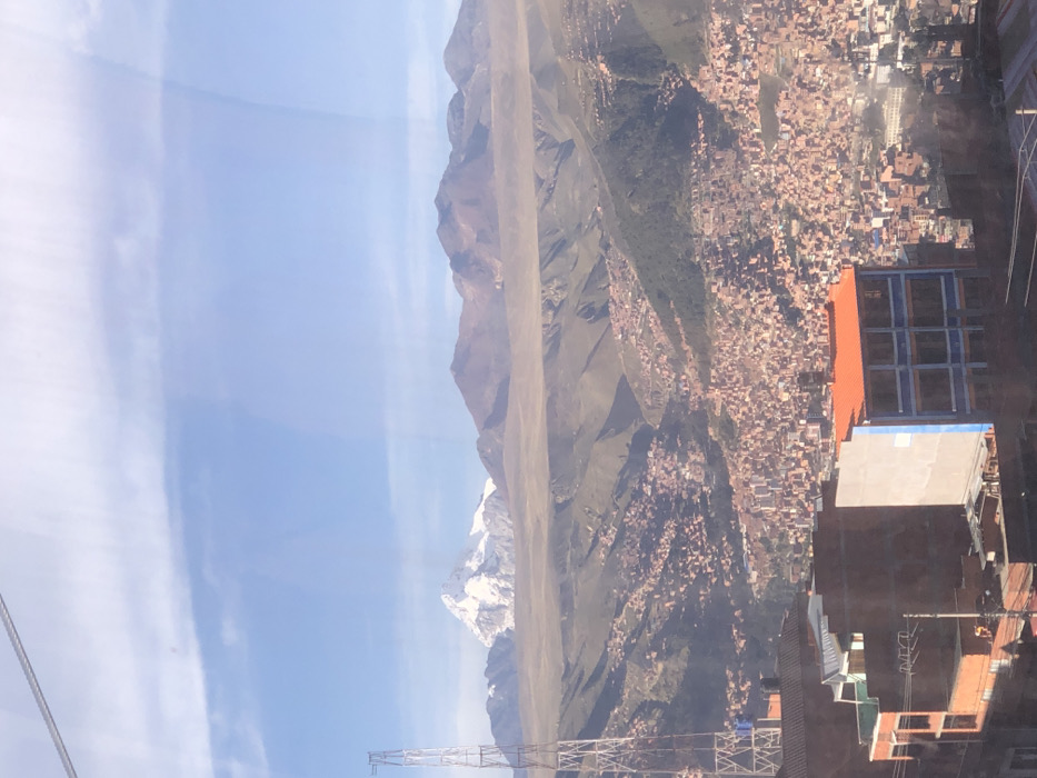 Mountains rise beside a densely populated urban sprawl under a partly cloudy sky. The sprawling city ascends the slopes, blending with the terrain. Buildings of varying heights are visible. Overhead power lines cross the scene. Patches of snow cap a peak in the distance. The view appears to be taken from a high vantage point, possibly a cable car or tall building.