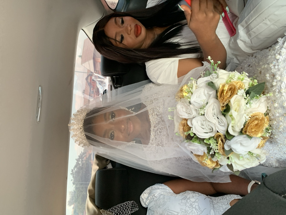 Inside a vehicle in the city of Ankpa, Nigeria, three individuals are seated. A young Black female, identified as a bride, occupies the center, facing the camera with a subtle smile. She wears a white, heavily beaded, long-sleeved wedding gown, a white veil, and a gold-colored tiara. She holds a large bouquet of white, gold, and off-white fabric roses with green foliage. To her right, another young Black female is seated, looking down at objects in her hands: a red item (possibly a phone or compact) and a mint green comb. She wears a white short-sleeved top and white pleated pants, with red lipstick visible. To the bride's left, a third individual is partially visible, showing a shoulder and arm in a light-colored, possibly blue or silver, patterned short-sleeved garment. The vehicle's interior is light-toned on the ceiling, with dark headrests visible. Through the rear window, blurred distant buildings with reddish roofs and some trees indicate an outdoor, daytime setting.
