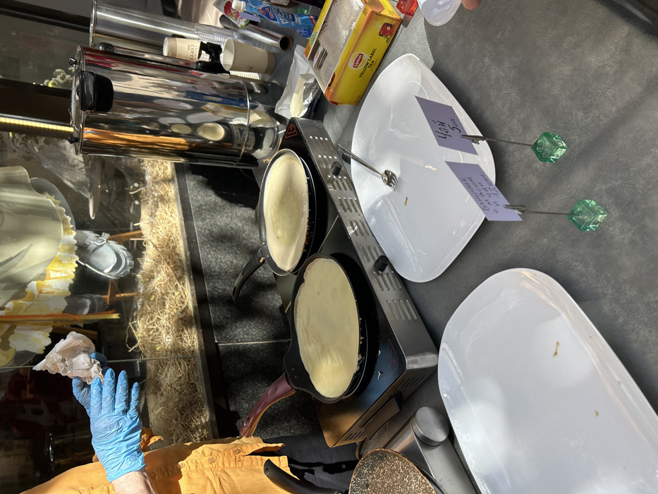 The scene depicts a street food stall setup, located in the city of Tel-Aviv, Israel, as indicated. A person is partially visible on the far left, wearing an orange long-sleeved shirt and blue disposable gloves, holding a crumpled piece of white paper or fabric. On a dark grey counter surface, two black non-stick frying pans are positioned on a portable electric stovetop. Both pans contain light-colored crepes or pancakes in the process of cooking. To the left of the stovetop, a dark, textured pan or wok is partially visible. To the right of the stovetop, a tall, cylindrical, stainless steel hot beverage dispenser stands. Adjacent to it are various items: several disposable coffee cups, clear plastic cups, a foil-wrapped block of butter, a yellow box of Lipton Yellow Label Tea, a small clear bottle with a red cap, and a white squeeze bottle. In the foreground, two rectangular white plates are laid out. One plate on the right has a silver fork resting on it. Two small pricing signs, written in a Cyrillic-based script (likely Russian or Ukrainian), are held by green glass cube stands with metal clips. The sign on the right reads "Чай 5 шек" (Tea 5 shekel), and the one on the left references "Блинчик" (Pancake) and "12 шек" (12 shekel). Behind the counter and the food preparation area, a large display window is visible, reflecting sunlight. Inside the window, a display features a bed of straw-like material. Above the straw, a portion of what appears to be a mannequin or prop wearing a light-colored, possibly yellow and white, garment and a shoe is visible. Strong sunlight illuminates the scene, creating defined shadows and highlights.
