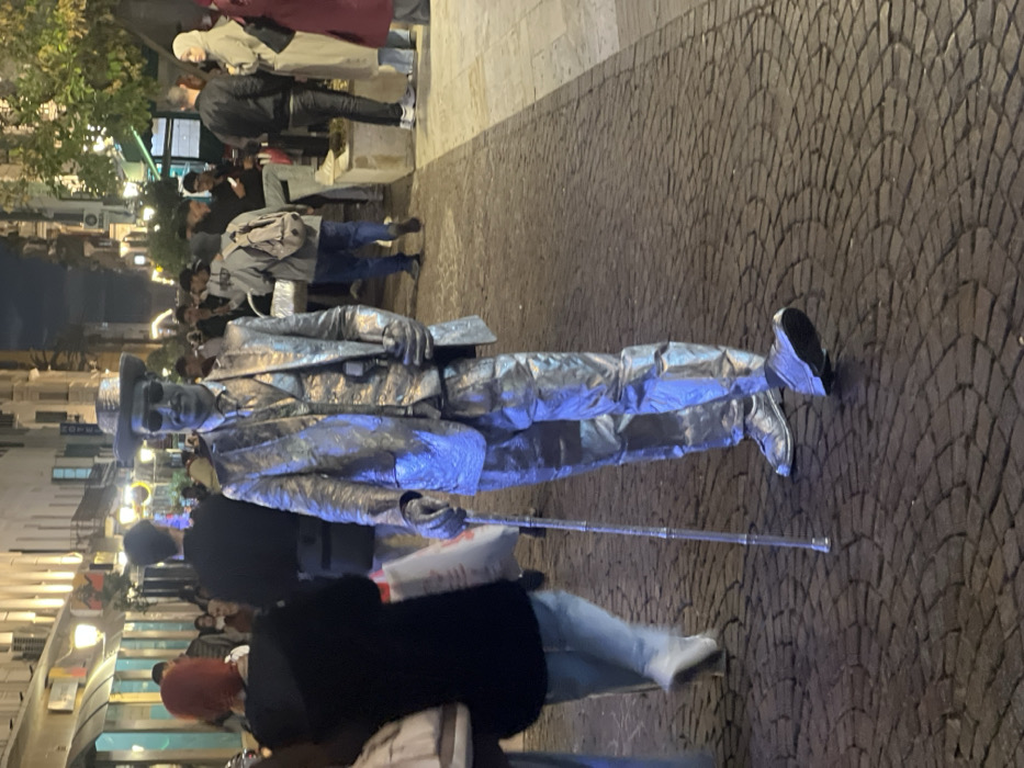 A street performer, painted entirely in silver, stands on a cobblestone street surrounded by onlookers. He wears a suit, hat, and sunglasses, holding a cane. Pedestrians walk around him, some holding shopping bags. Buildings line the background, indicating an urban setting. Street lights illuminate the scene. The image is slightly rotated.