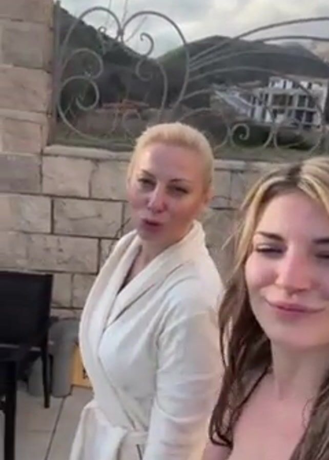 group of five women outdoors on a sunny day. In the initial frame, two women are facing the camera, one in a white robe and the other in a bikini. Behind them are stone walls, wrought iron fencing, and a building on a distant hillside. The camera pans left, revealing a third woman in a pink robe and then follows the first two women. Two more women in bikinis walk by. The women greet each other in Russian. The environment includes stone walkways, plants, and mountains in the background.