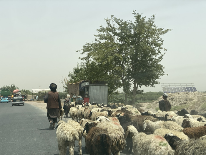 The image depicts a rural roadside scene in Deh Sabzi, Afghanistan, under a hazy, light-colored sky