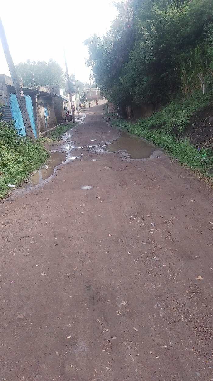 A dirt road, uneven and muddy with puddles, stretches into the distance