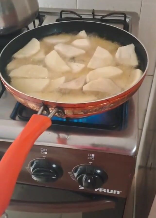 kitchen scene. First, there is a close-up of a pan filled with oil and light-colored, triangular pieces of food, likely plantains, are being fried on a gas stove. The stove is silver with brown accents and black knobs. Above and to the left of the pan, there is a stainless steel pot. The backdrop is a tiled wall. The camera then shifts to a person wearing a pink shirt, looking directly at the camera, with a neutral facial expression. Their hair is braided into small twists. The background is a white ceiling.