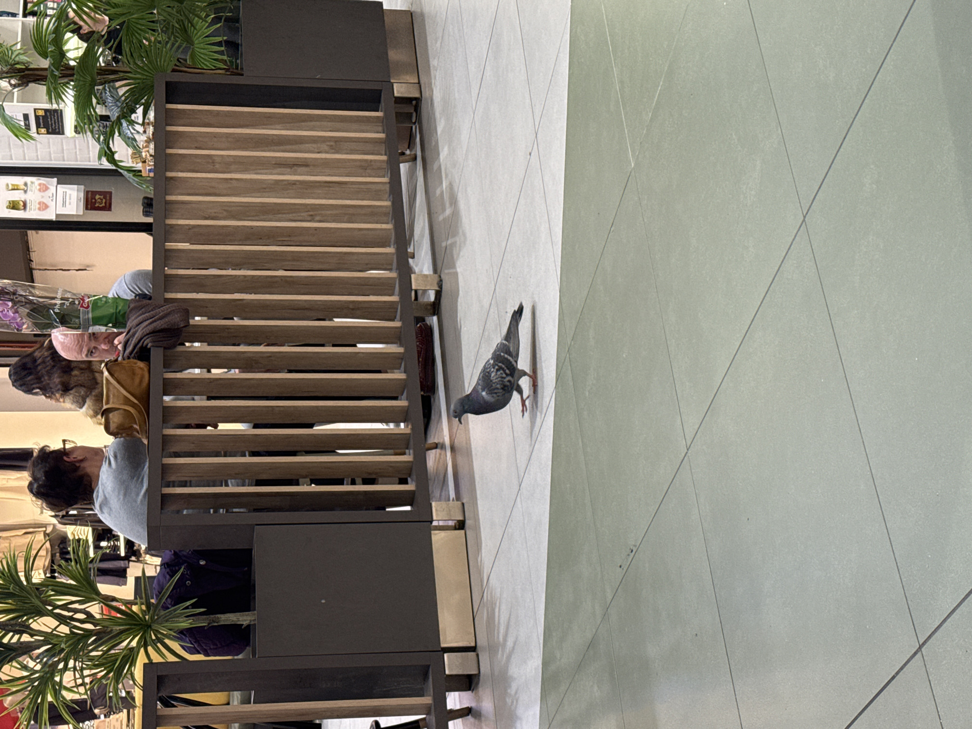 A pigeon is standing on a tile floor in what appears to be an indoor space. The foreground contains a brown slatted wooden structure with dark gray ends that may be part of a planter or display. People are visible behind the structure. In the background are retail displays, including plants. The specific location in Sofia, Bulgaria is not discernible from this image alone.