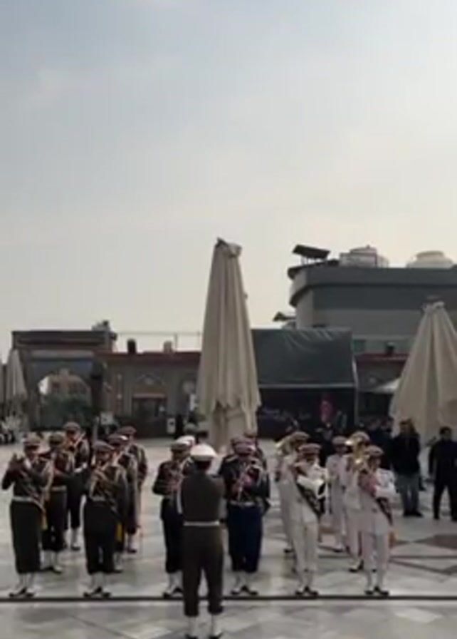 military band performing on a patterned tile plaza. The band consists of members in two different uniforms: dark green with brown trim and white with red trim. The musicians are arranged in rows and are playing instruments, including clarinets, flutes, and brass. A conductor in a brown uniform stands in front, directing them. The plaza is surrounded by buildings and covered umbrellas. The sky is overcast, suggesting a dull, daylight setting. People are walking in the background.