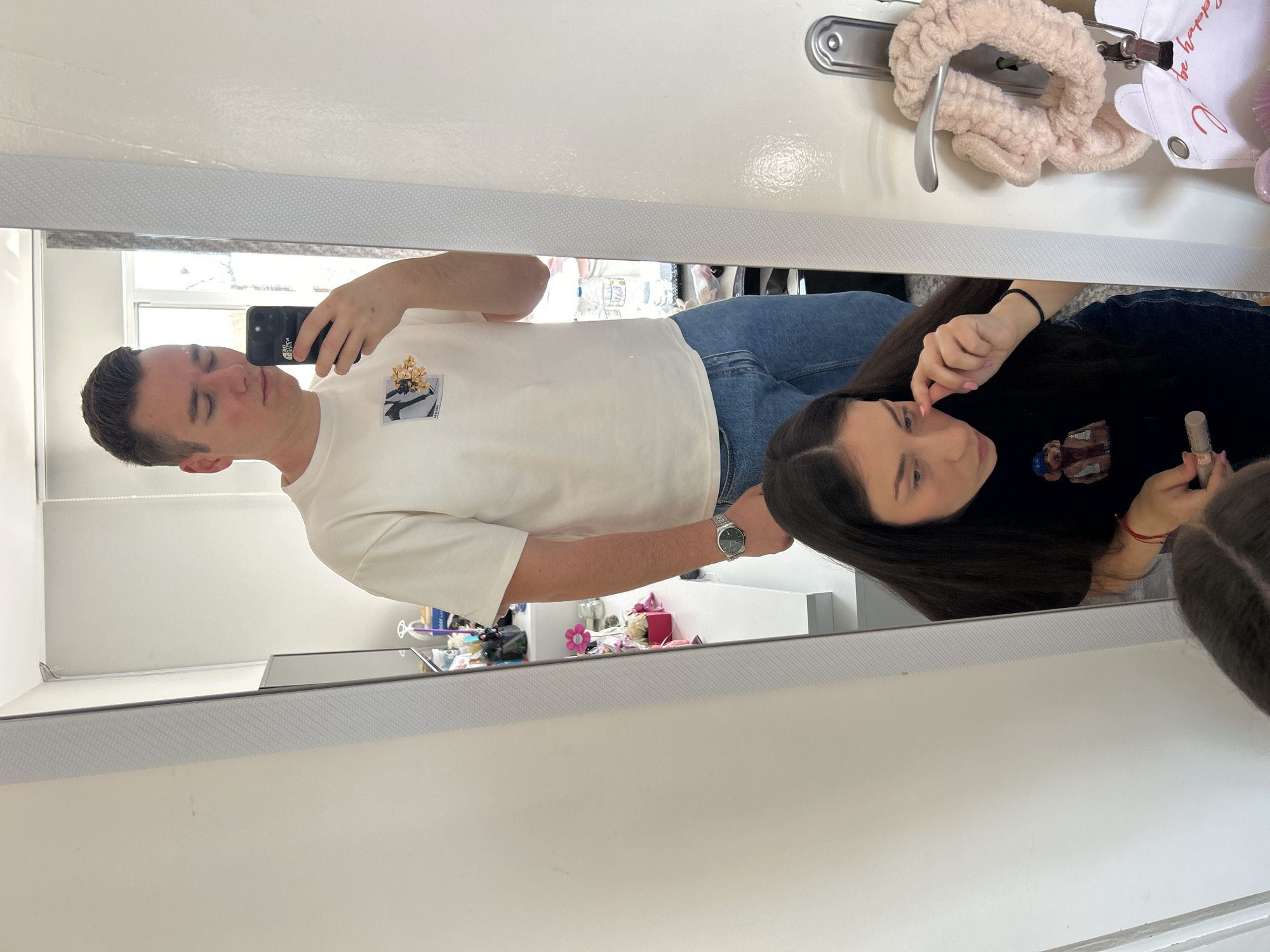 A mirror selfie shows a man and woman in an indoor setting. The man is holding a smartphone and facing the mirror. He is wearing a white T-shirt with a graphic print and blue jeans. The woman is wearing a black long-sleeve shirt and appears to be applying makeup. The location appears to be in a bathroom or bedroom based on the mirror and the items on the shelf in the background, but it's not possible to determine if it is in Bukovlak, Bulgaria based on the image alone.