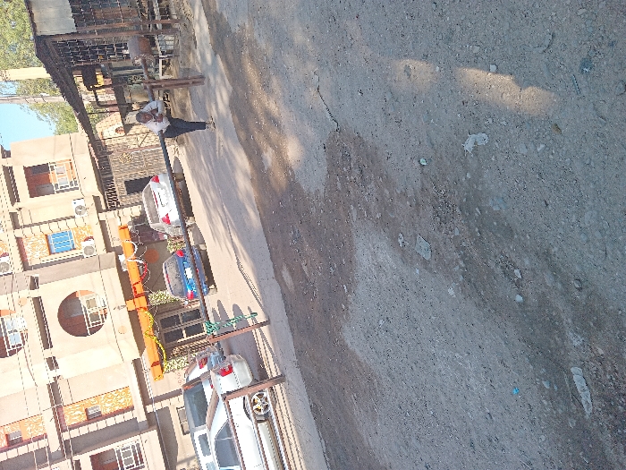 A rotated view shows a street with a building on one side and a paved surface on the other