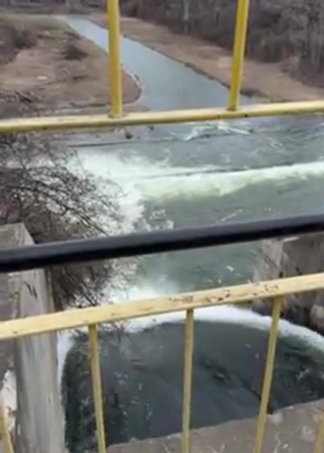 view from a bridge overlooking a river. The bridge has yellow and black railings. The river flows vigorously over a small dam or weir, creating a white foamy texture where the water cascades down. The river is flanked by bare vegetation on either side. In the distance, some buildings and a tree-covered hill are visible. The sky is overcast.