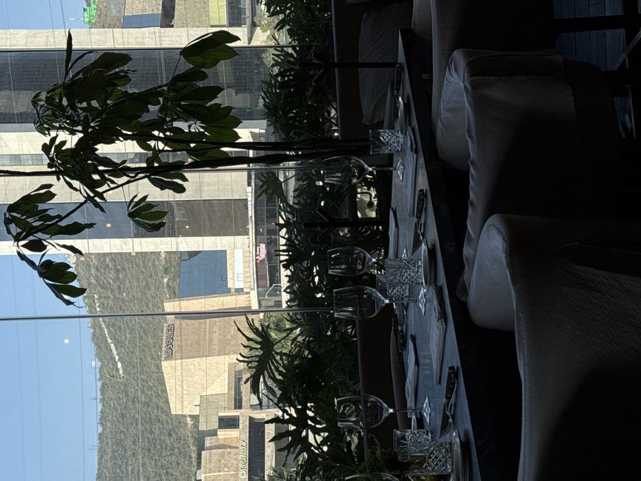A dining table is set for a meal, adorned with wine glasses, water glasses, and utensils. Potted plants frame a window with a view of a city skyline, reflecting in the glass. The scene is partly obscured by the foliage. Comfortable-looking chairs surround the table, creating a cozy and inviting atmosphere.
