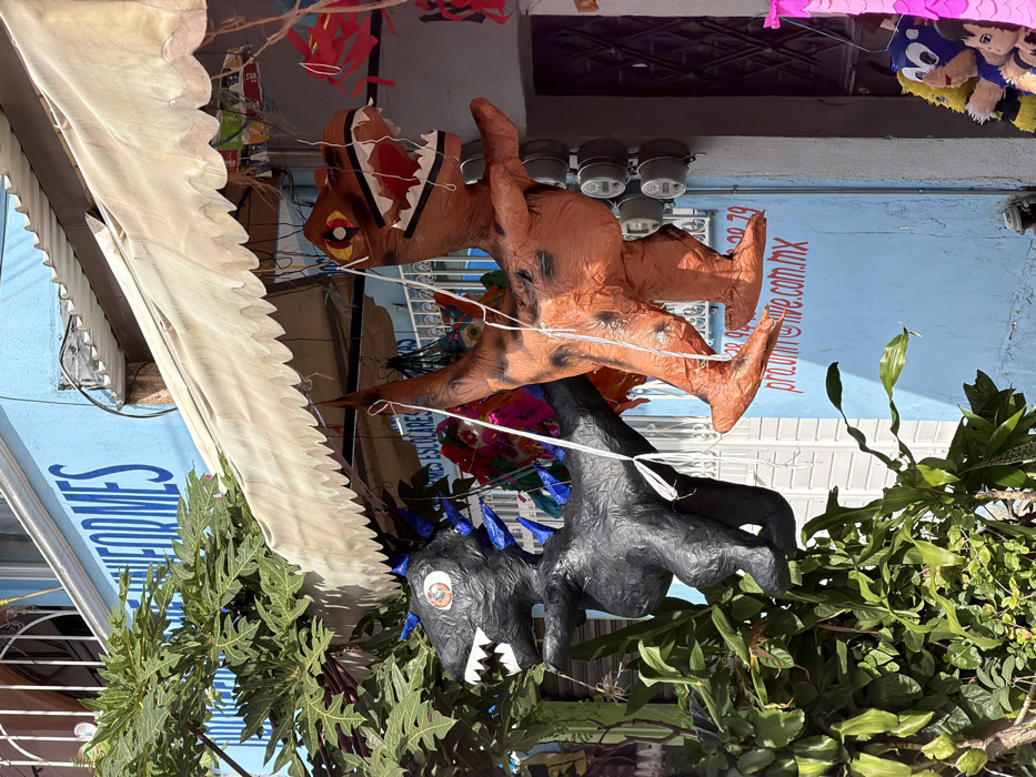 - "Hanging outside a building with blue trim and a white awning are two dinosaur piñatas" by FM-Ft7F82, licensed under CC BY 4.0