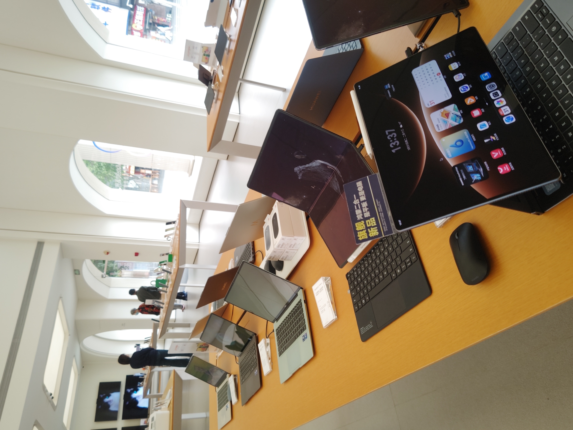 Here is a detailed description of the image: **Location:** Chongqing High-tech Zone, China (based on the presence of Chinese characters and common product brands). **Scene:** The image appears to be taken inside a retail store, specifically a technology store displaying Huawei products. **Objects:** * Multiple Huawei laptops and tablet devices are arranged on a table. * A tablet computer is featured prominently in the foreground, displaying an interface with a calendar date (March 31) and a time of 13:37. * The laptops have different screen sizes and colors. * A mouse is placed near the tablet. * Boxes of peripherals, like keyboards, can be seen among the devices. * A sign promoting a "Flagship Harmony Two-in-One New Product" can be seen beside one tablet. **People:** * A number of people are seen in the background, browsing other sections of the store. **Actions:** * It appears that the laptops and tablets are displayed for customers to interact with. **Environment:** * The store is well-lit, with large windows and a modern design. * The tables have a light wood finish.