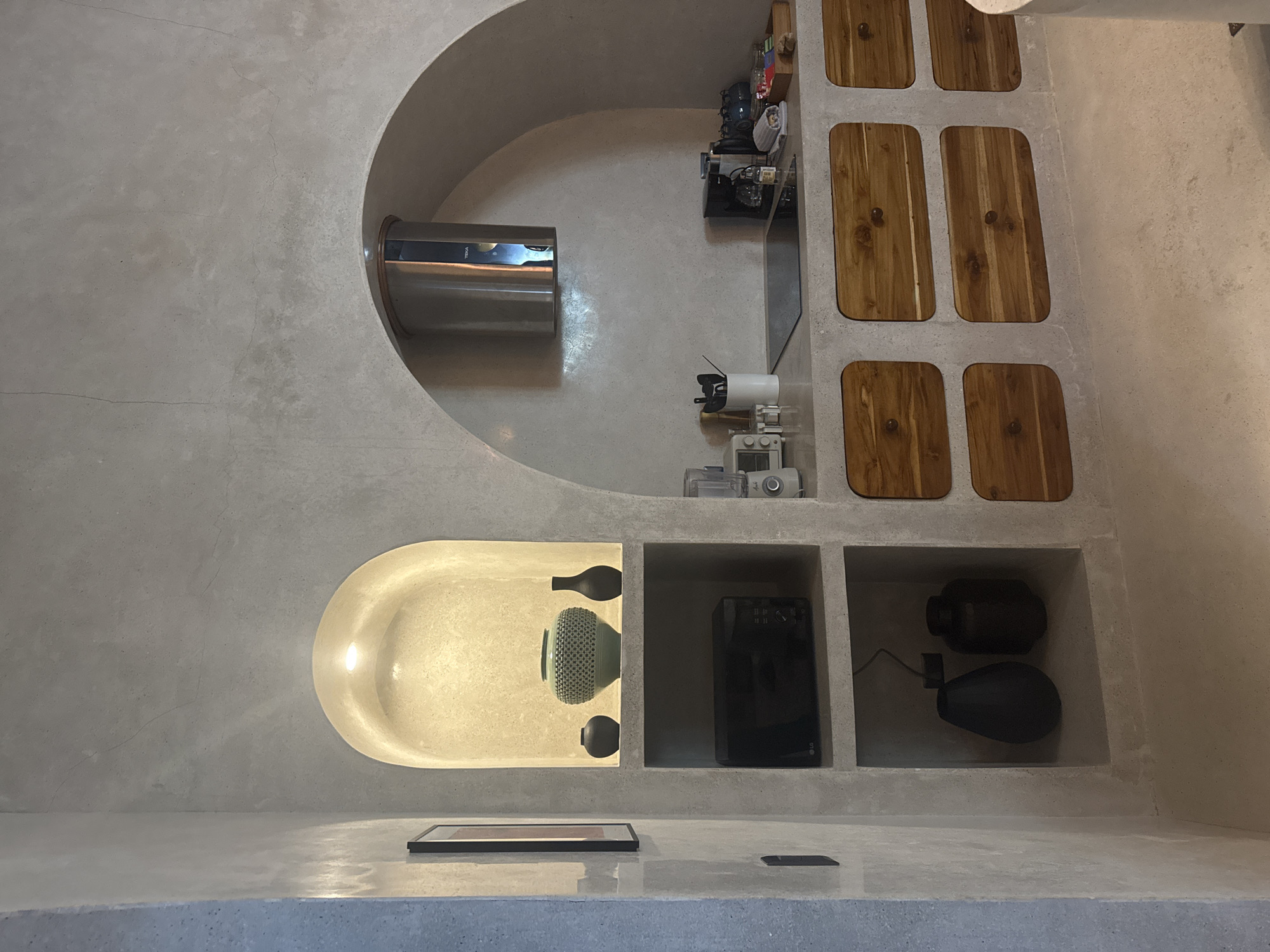 This image depicts an interior view of a minimalist kitchen or kitchenette situated in El Nido, Philippines. The space is characterized by light gray, textured concrete or stucco walls and floor. On the left, a built-in vertical structure features two recessed display shelves. The upper shelf, an illuminated arched alcove, showcases three decorative vases: a large, textured teal vase flanked by two smaller, dark-colored vases. Directly below, a black LG microwave oven is situated on a middle shelf, and two dark, bulbous vessels occupy the bottom shelf. A framed artwork hangs on the adjacent wall to the left. The main kitchen area is set within a large arched concrete alcove, encompassing a gray countertop. A stainless steel cylindrical range hood, bearing the "TEKA" brand, is mounted above a black induction cooktop. To the left of the cooktop, a blender and a white toaster are visible, along with a white utensil holder containing various kitchen tools. To the right, a black coffee maker, several jars, a folded gray towel, and a wooden tray filled with assorted items are arranged on the counter. Below the countertop, the concrete base incorporates six wooden cabinet doors, each with rounded corners and a central circular pull. No individuals are present in the scene.