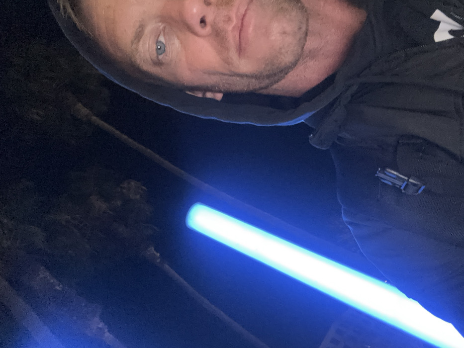 The image captures a nighttime selfie of a male individual in Long Beach, United States of America. The subject is depicted from mid-face to upper chest, possessing light blue eyes and visible stubble. He wears a dark hooded sweatshirt, with the hood pulled over his head. A metallic-colored buckle or clip is visible on the right shoulder of his garment or a strap worn over it. To the left and slightly behind the subject, a prominent, elongated cylindrical object emits an intense, bright blue light, consistent with the appearance of a prop lightsaber. The background is dark, indicating an outdoor nighttime setting, with the silhouettes of multiple tall palm trees faintly discernible. A indistinct lighter structure is visible in the lower left background, beneath the glowing blue object.