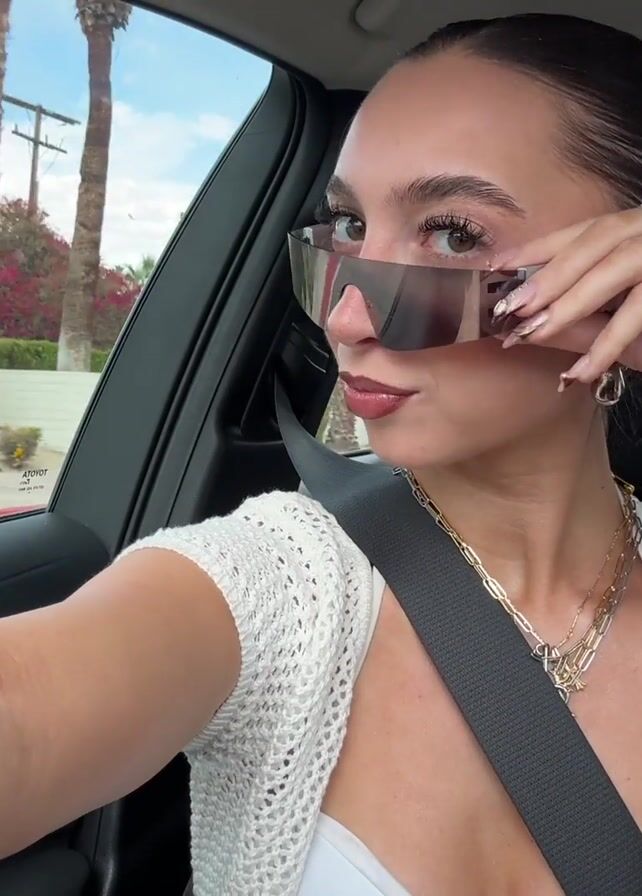A young woman is seated in the driver's seat of a car, wearing a white crocheted top over a white tank top, multiple gold necklaces, and many bracelets. She is wearing dark glasses, and takes them off in the first second of the video. She is smiling at the camera. The car is moving through a residential area with palm trees and colorful landscaping visible through the windows. Upbeat music plays. The woman is wearing a seatbelt.