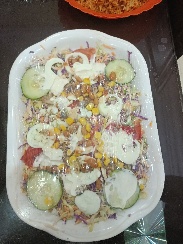 A white rectangular dish holds a salad covered in plastic wrap. The salad consists of shredded lettuce and carrots, sliced cucumbers, corn, beans, diced tomatoes, and circular, creamy-white toppings, possibly hard-boiled eggs. The dish sits on a dark surface, with a plate of reddish-brown food visible in the background. The wrap obscures details, creating a slightly blurred appearance.