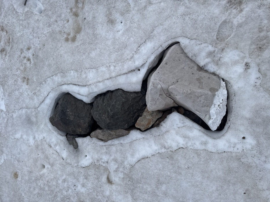 A cluster of rocks peeks through a thinning layer of snow and ice. Three darker, rounded stones lie adjacent to a larger, jagged rock with a white, fractured edge. The surrounding icy surface is uneven, with melting occurring around the rocks, creating a rim of darker, saturated ice. Small depressions dot the surface of the snow, indicating further melting.