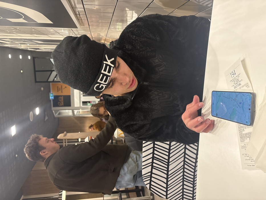 At a McDonald's, a person wearing a black "GEEK" beanie and dark furry jacket is looking at a phone displaying a map