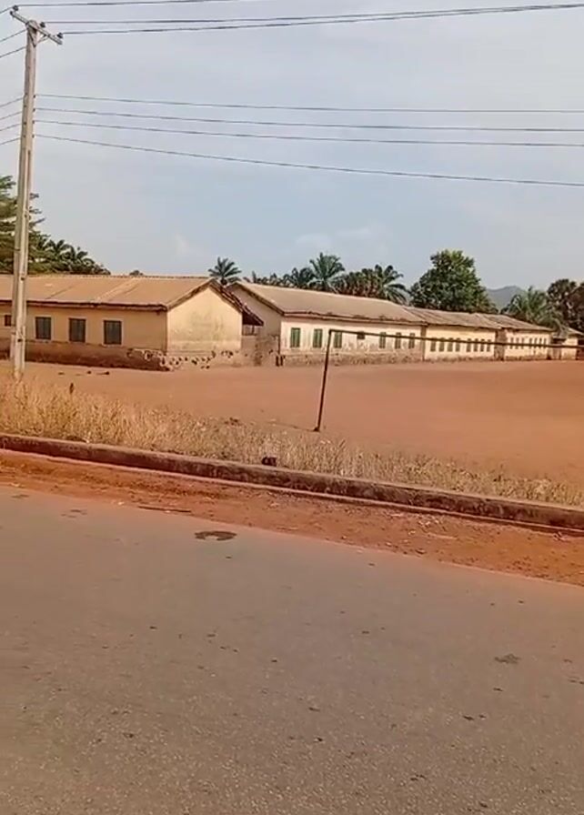 long, low, light-colored building with a series of windows along its length. The windows have dark frames, possibly green. The building has a slightly rusted roof. In front of the building is a large, flat area of reddish-brown dirt. The ground is mostly bare. A dark, thin pole stands upright in the field. Separating the field from the road is a low, reddish-brown curb. The road in the foreground is paved and light gray. Above the building, there are trees and a sky that is mostly overcast. There are power lines overhead. Some people are standing in a group near the building.