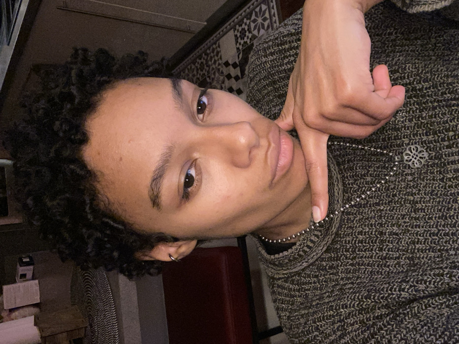 A young person with dark curly hair poses close to the camera