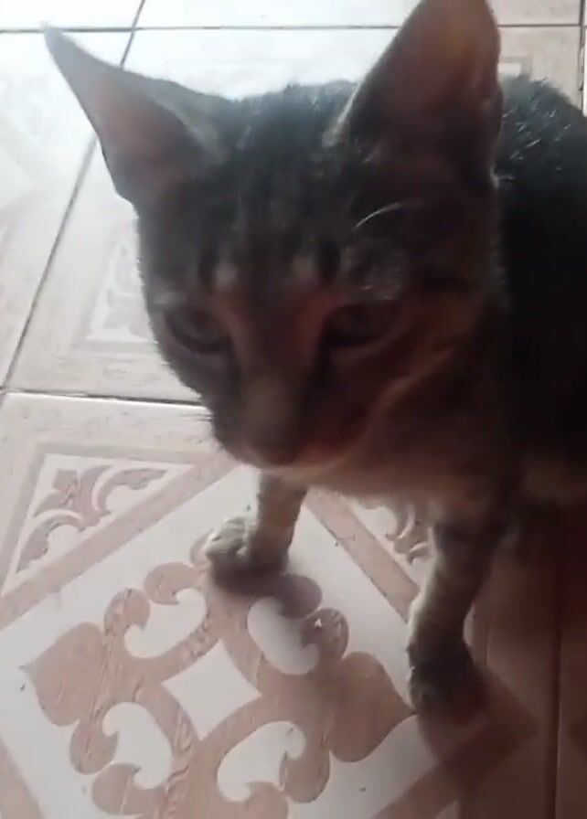 A small, brown tabby cat with a long tail stands on a tiled floor
