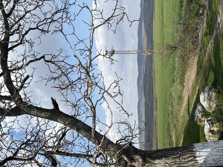 The image depicts a rural scene in Sadievo, Bulgaria, under a partly cloudy sky. In the immediate foreground, to the left, a large, leafless deciduous tree dominates, its bare branches extending across the upper portion of the frame. The lower section of the tree trunk is painted white. At the base of the tree, three light-colored, irregularly shaped rocks rest on green grass. A dirt path, exhibiting tire tracks, traverses the midground diagonally from the lower left towards the right, separating a patch of grass from a vast, verdant agricultural field, likely planted with young crops. Further into the midground, to the right, a tall, metallic lattice electricity pylon stands within the green field, supporting horizontal power lines partially obscured by tree branches. A small, bare bush is visible near the pylon's base. The background features a range of rolling hills or low mountains under a blue sky interspersed with white cumulus clouds. A small cluster of structures is faintly visible on one of the distant hills. No individuals or animals are present in the scene.
