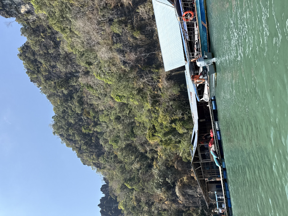 A narrowboat with a white roof is docked alongside a lush, steep, rocky hillside covered with dense vegetation. The boat appears to be a tour vessel, with people visible on board. The water adjacent to the boat is a muted green color. A bright blue sky peeks out from behind the hillside.