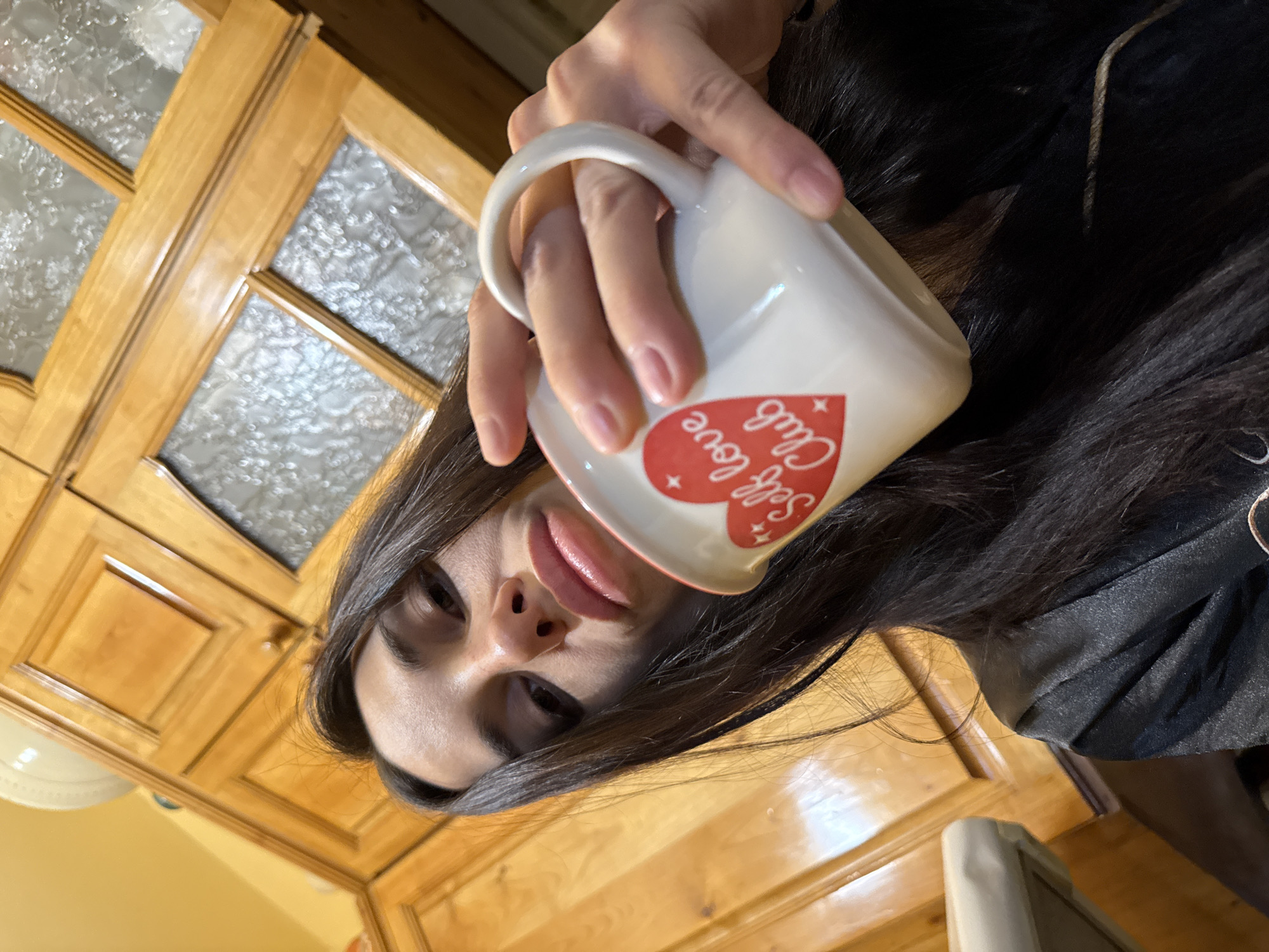 A woman holds a white mug with a red heart and the words "Self Love Club" printed on it