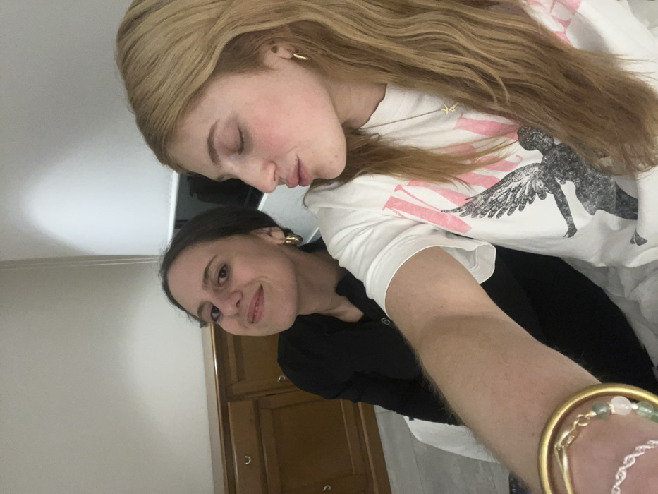Two women pose closely together. The woman on top has long, wavy blonde hair and wears a white t-shirt with a graphic print. Her eyes are closed, and she leans slightly towards the other woman. The woman below has dark hair pulled back, revealing large hoop earrings. She wears a black shirt and smiles, looking towards the camera. A person's arm with bracelets is visible in the foreground. A beige colored cabinet is in the background. The photo appears to be taken indoors.