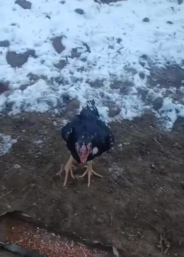 two black chickens in a dirt and snowy area. One chicken is mostly visible, and the other is partially visible. The chicken in view is pecking at the ground near a wooden trough-like object. The ground is mostly dirt, with patches of snow visible. The chickens are the only visible creatures in the video. The camera moves slightly but remains focused on the chicken. The environment appears to be rural, possibly a farmyard or backyard.