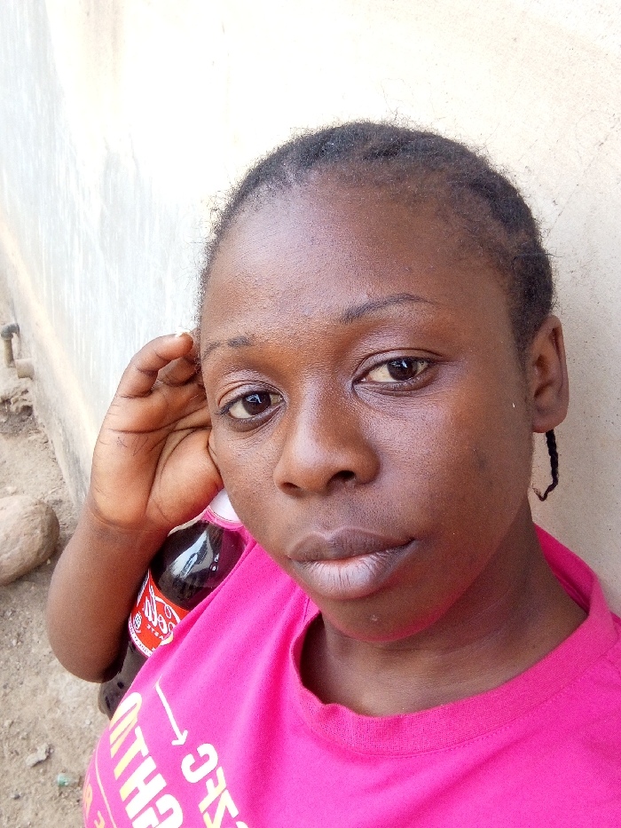 A female individual, appearing to be of African descent, is depicted in a medium-shot, facing forward and looking directly at the camera. She has dark skin, dark eyes, and short, dark braided hair. She wears a bright pink t-shirt with inverted white text visible on the chest. Her right hand is raised and positioned near her right temple/ear. A plastic Coca-Cola bottle with a red label and white cap is partially visible behind her right arm and shoulder. The background features a light-colored, textured wall with a small, dark pipe or fixture on the left. A smooth, light brown stone rests on the ground to the lower left. The ground appears to be earthen or concrete. This scene is located in the city of Agban, Nigeria.