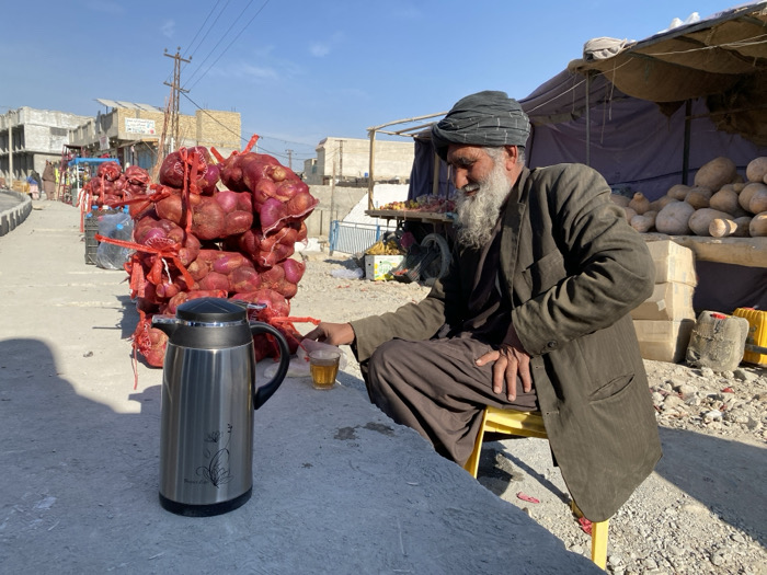 In Gundigan Village, Afghanistan, an outdoor scene depicts an elderly man seated on a yellow stool on the right side of a paved area. He possesses a long white beard, wears a dark turban, dark jacket, and dark trousers. He holds a small, clear glass containing an amber liquid. To his left, a large stainless steel thermos with a black handle and lid rests on the pavement. Behind the thermos, a substantial quantity of red onions, individually netted in red mesh bags, is stacked vertically on what appears to be a cart or vehicle. In the background, on the right, a market stall with a brown tarp roof displays numerous large, pale gourds or squashes. The background on the left features a curved road and several multi-story buildings under construction or in disrepair. Utility poles and power lines are visible against a clear blue sky. Long shadows extend across the ground, indicating strong sunlight.