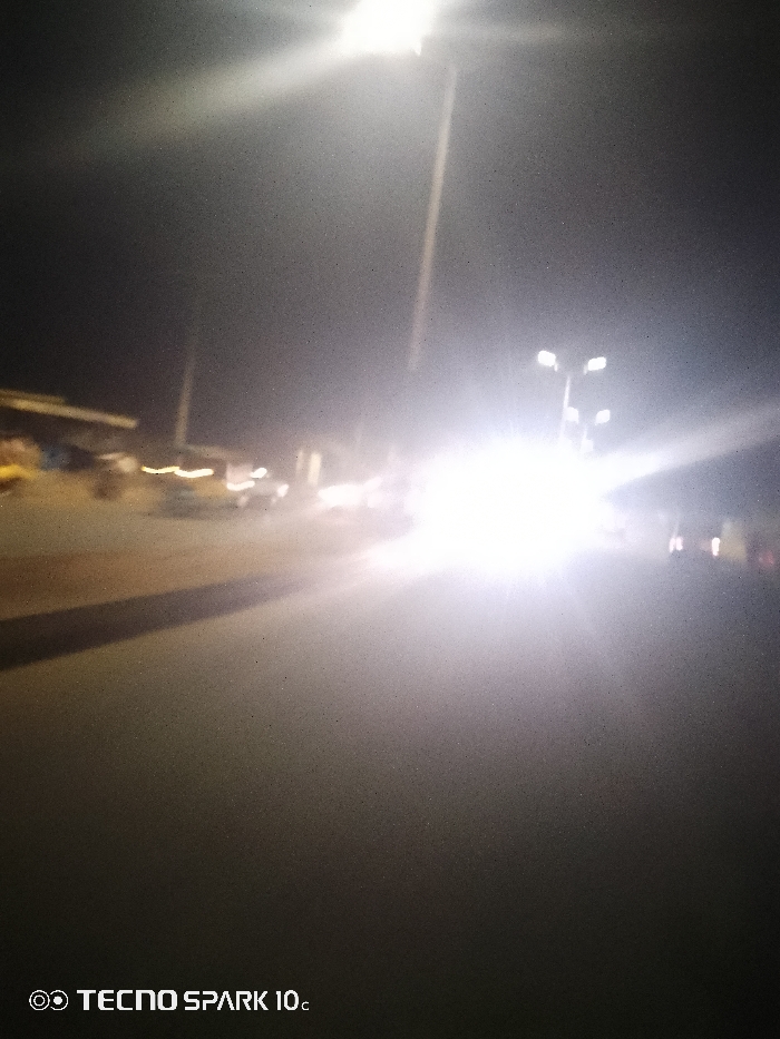 A blurred, night scene depicts a dark asphalt road illuminated by bright, glaring lights. A tall street lamp stands to the left, while other light sources suggest buildings and possibly vehicles in the background. The road's surface reflects some of the light, creating a gradient from dark to light. The image is grainy and lacks clear details due to low light conditions and motion blur. The bottom left corner contains text indicating the image was taken with a TECNO SPARK 10c phone.