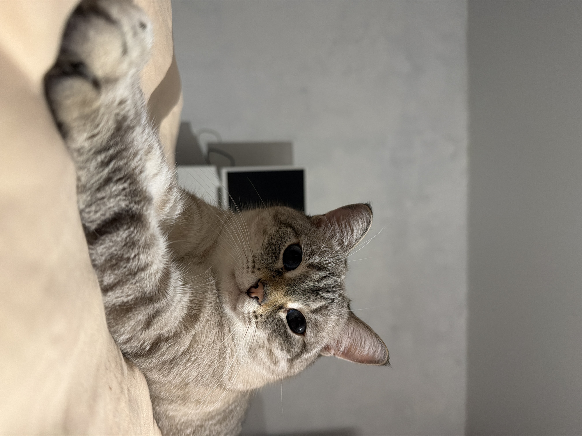 A domestic cat with light gray and tan striped fur and large, dark eyes is seen from a low angle, looking down at the viewer. The cat's left paw is extended upwards, resting on a beige-colored surface, possibly upholstery. The background is a neutral gray wall, with a partially visible television and other electronic device in the distance. The location is likely indoors. There is no indication of the image location being Perm, Russia.