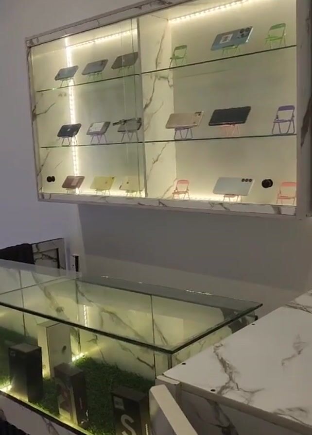 interior of a mobile phone store. The camera pans across various displays, starting with a cabinet filled with phones and small colorful chairs. Below this cabinet is a glass display case showcasing boxed phones arranged among artificial grass. The camera then moves to a wall featuring phone cases hung on hooks, and finally captures a man seated behind a counter, apparently an employee of the store. The store's color scheme appears to be primarily white with marble accents.